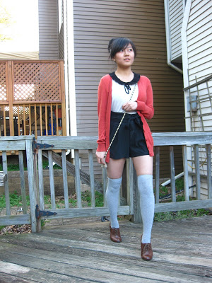 It's such a weird time of year to dress for - the weather is sunny but it's still nippy outside. Where did spring go?? I mean, it's almost May and I feel like the temperature is just stuck in the 50s and low 60s. BUT I refuse to let a little cold take away my love of spring clothing. Like these high-waisted shorts! I just paired them with knee socks and a cardigan to keep warm while making my position on the weather known :]
