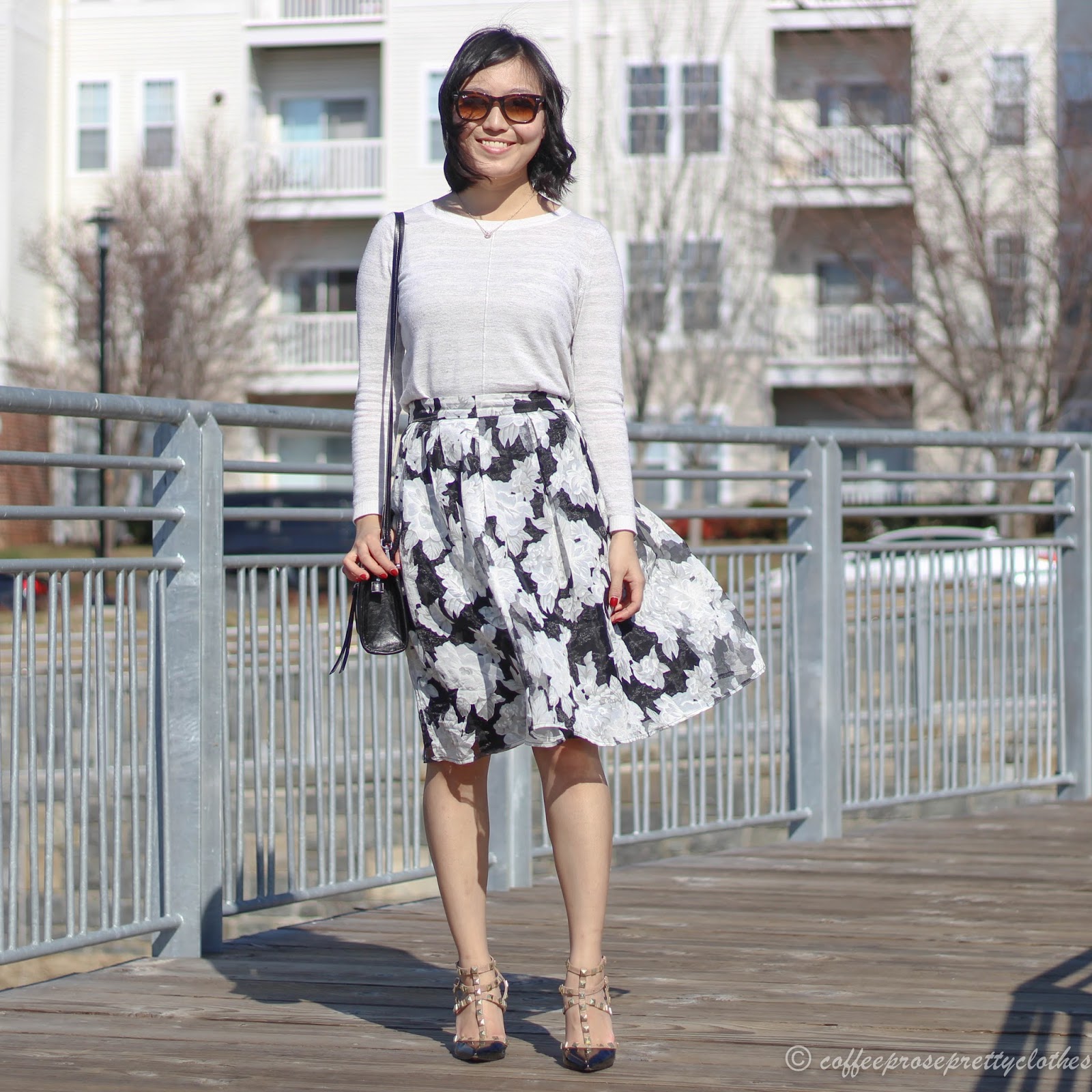 To celebrate the first few signs of warm weather, I pulled out my floral midi skirt! I absolutely adore the tulle and the big floral patterns (can you tell I'm a flower power kind of girl?) In my attempt to mix patterns, I paired the skirt with a striped sweater. The stripes are a very subtle light gray that doesn't clash too much with the black and white of the skirt.