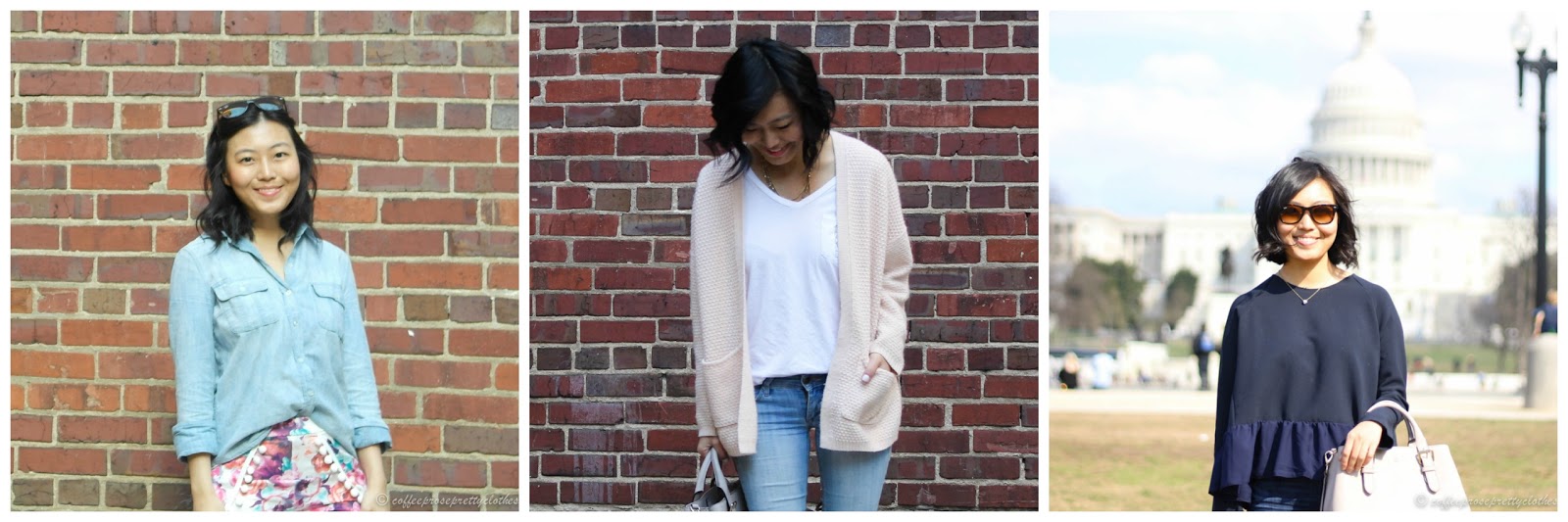 - Chambray shirt: This piece has been a regular since the early days of my blog. I've made an update to the one I used to wear and bought a lighter-colored one for a great price at Forever 21. Quality-wise, I think it's great and it's certainly held up for the last three years! I found a similar looking one from F21 here but I also love the ever-popular ones by Madewell too.