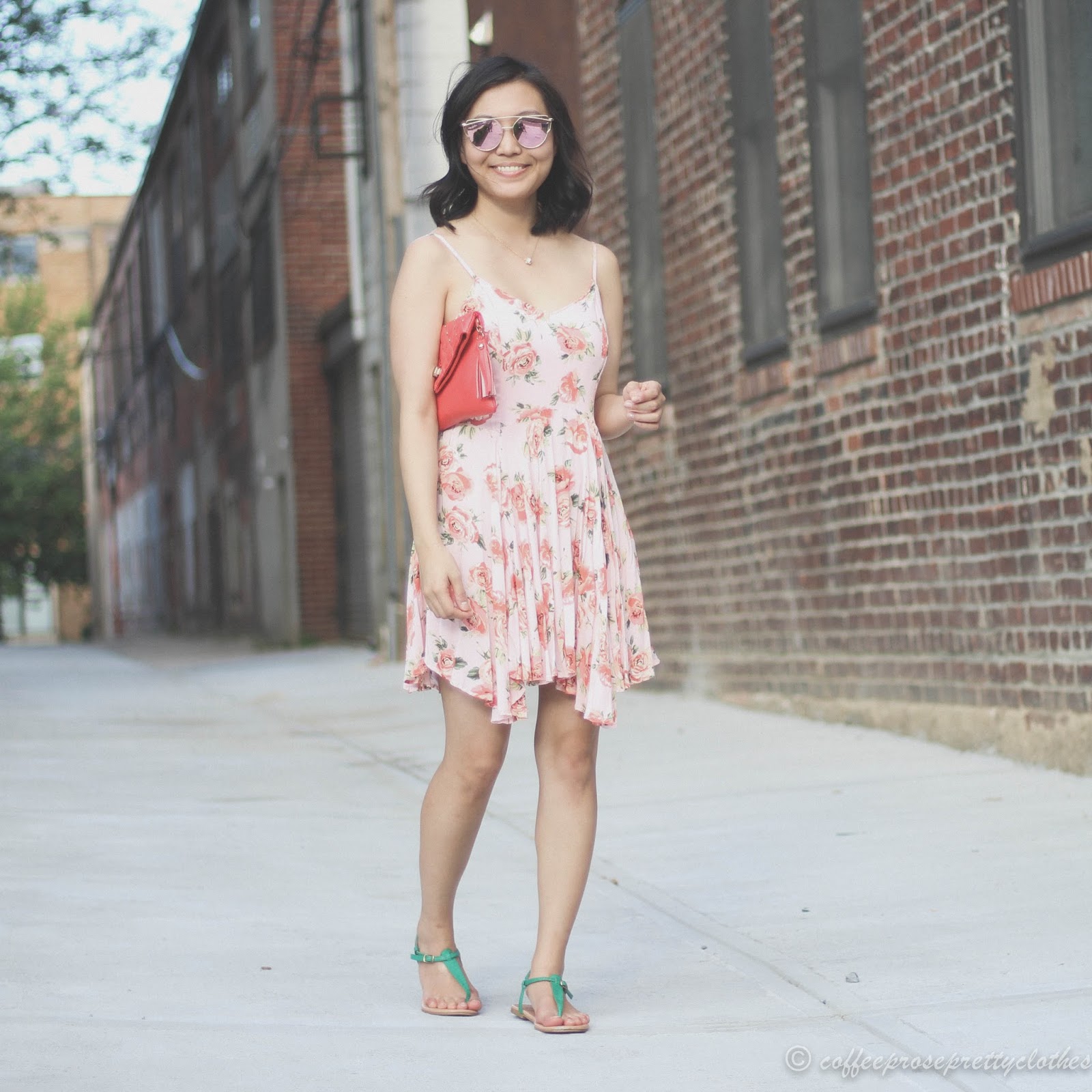 As for the rest of my outfit, I was inspired by the rose gold color of my glasses and decided to pair them with other rose gold or pink-adjacent colors. I bought this lovely handkerchief-hem dress from Forever 21 years ago when I needed a dress to wear to the pool over my swimsuit that would also work for grabbing a summer brunch. I think it looks lovely with this coral clutch (also picked up at a sale years ago). I decided to add a contrasting color by wearing my green t-strap sandals, inspired by the green leaves on the pattern on my dress.