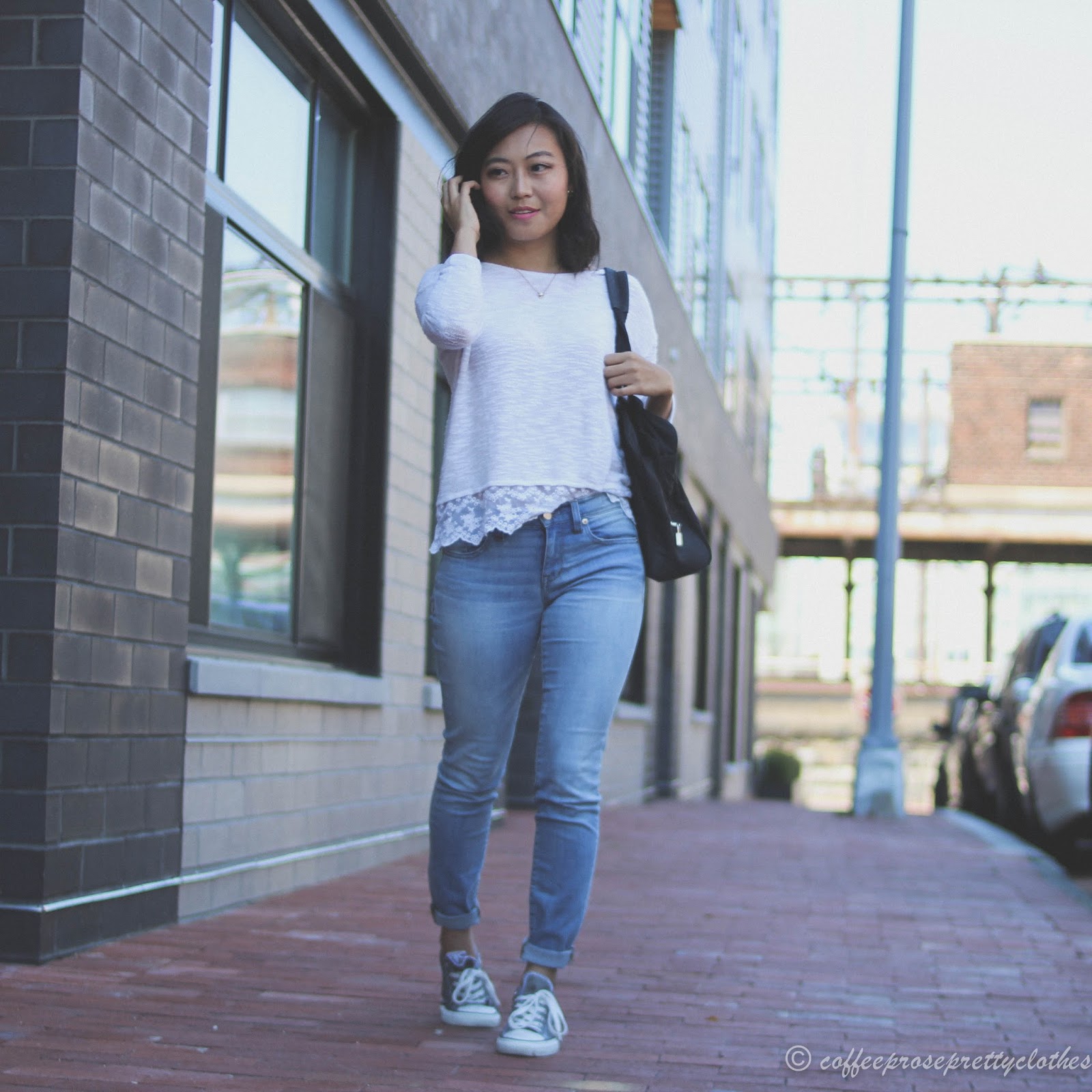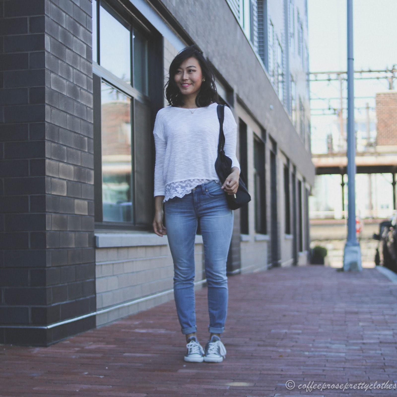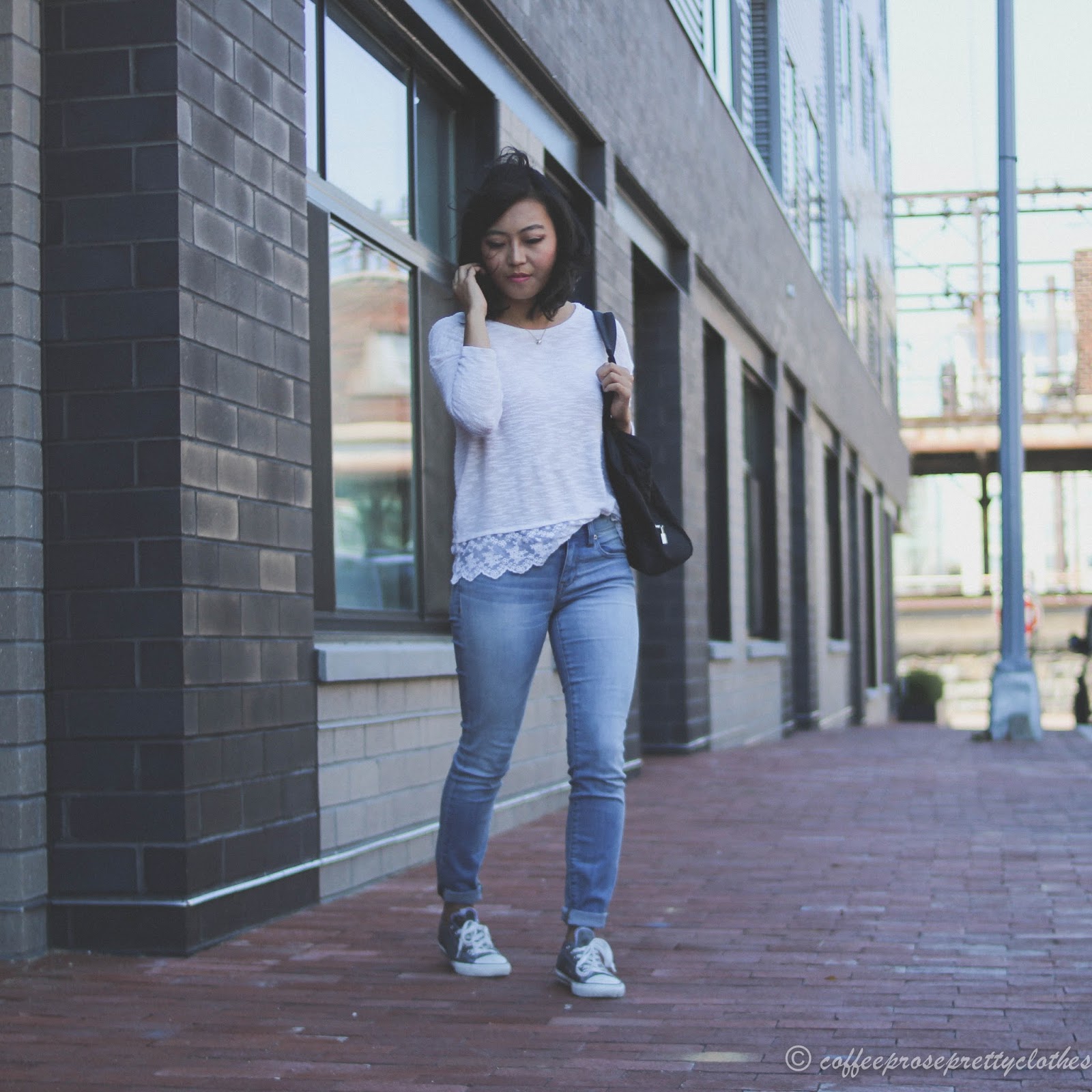 Absolutely love the contract of the feminine lace top with your Chucks! Perfect Saturday outfit.