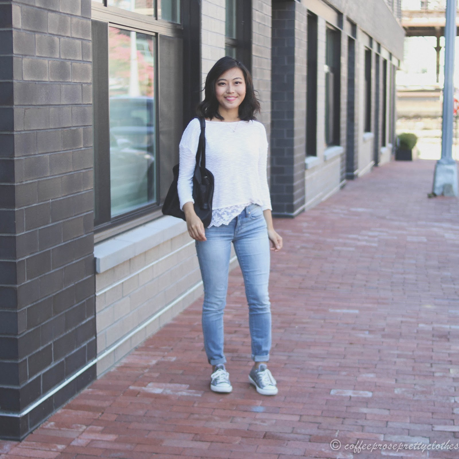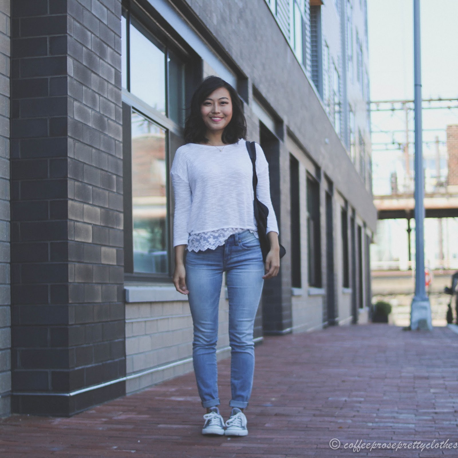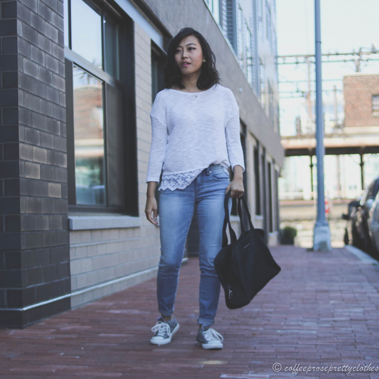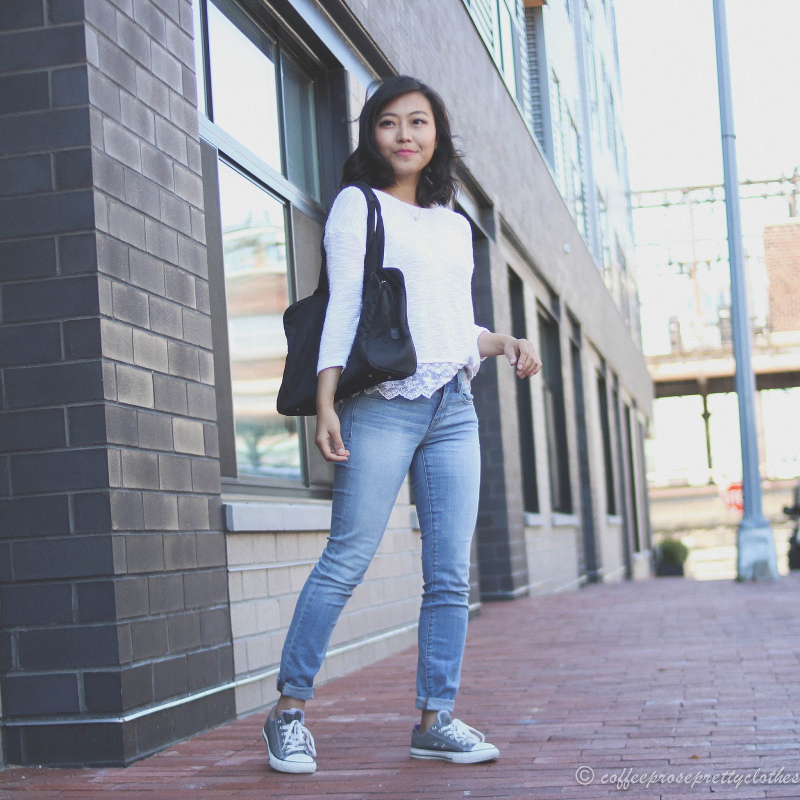 Absolutely love the contract of the feminine lace top with your Chucks! Perfect Saturday outfit.