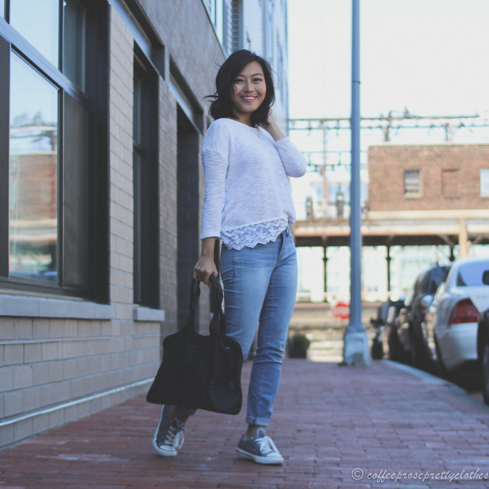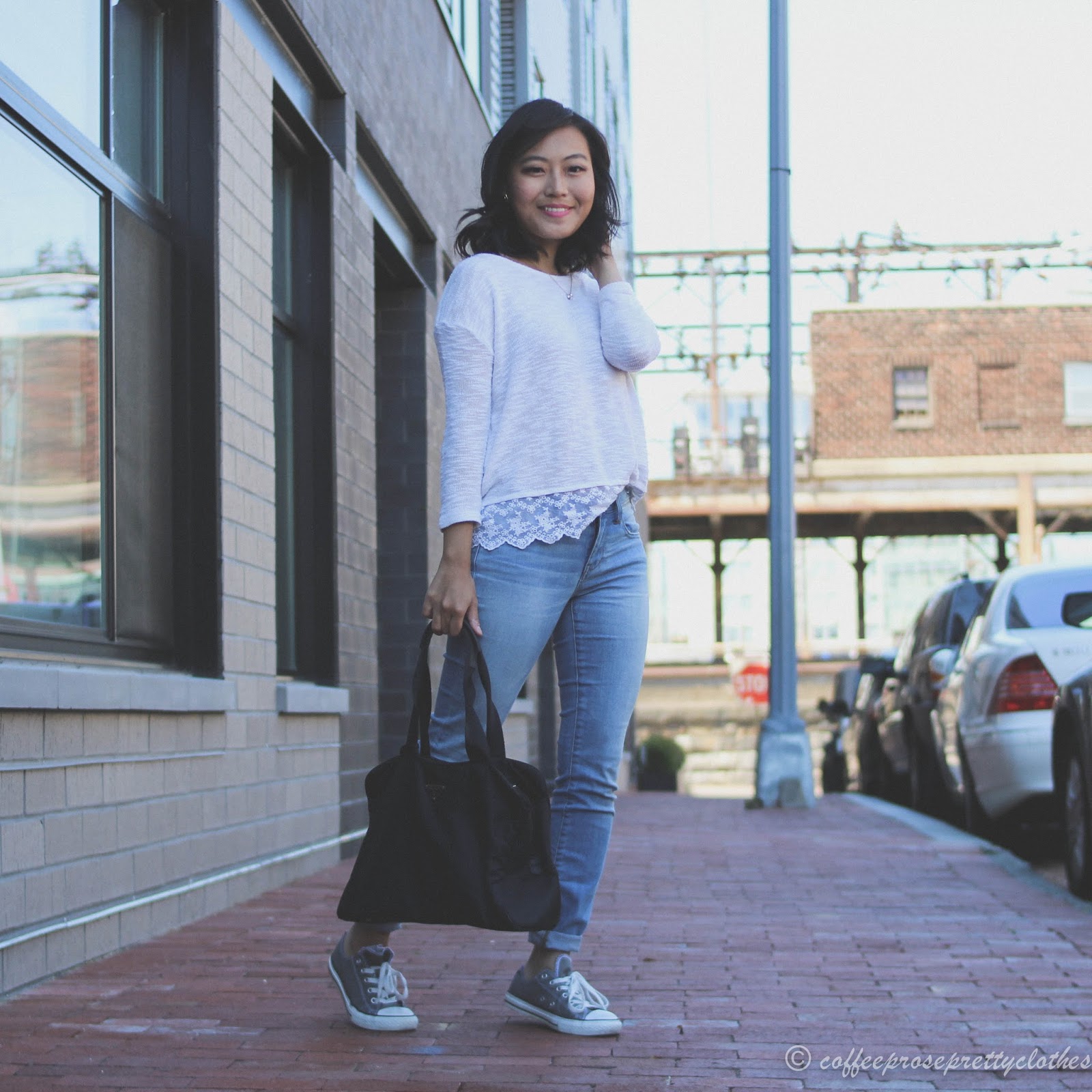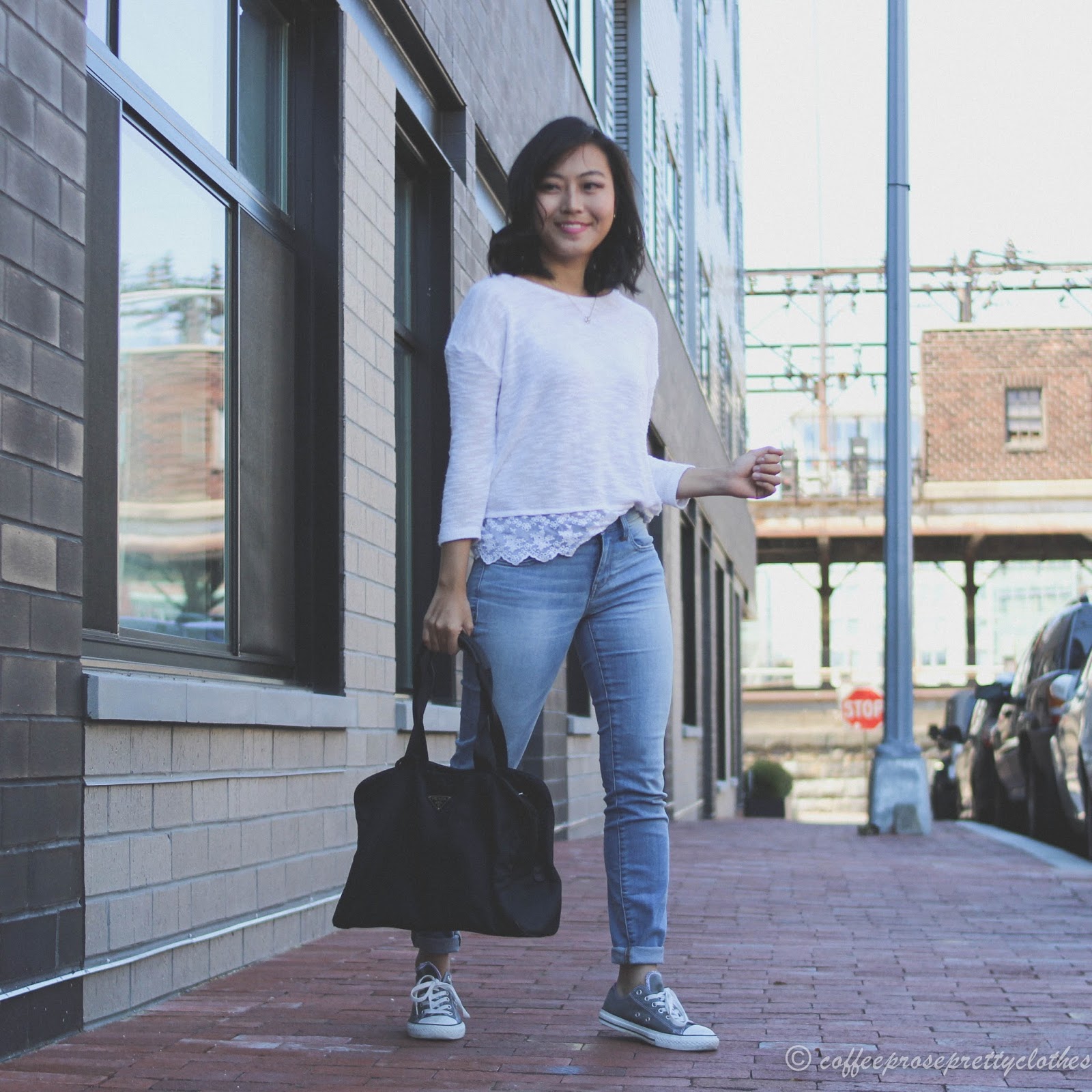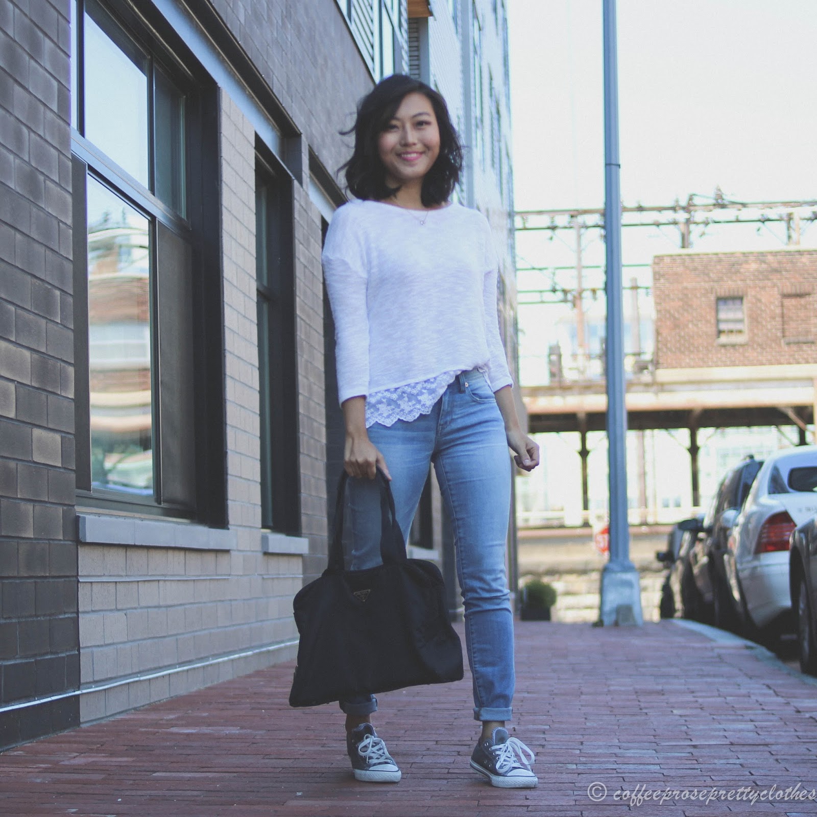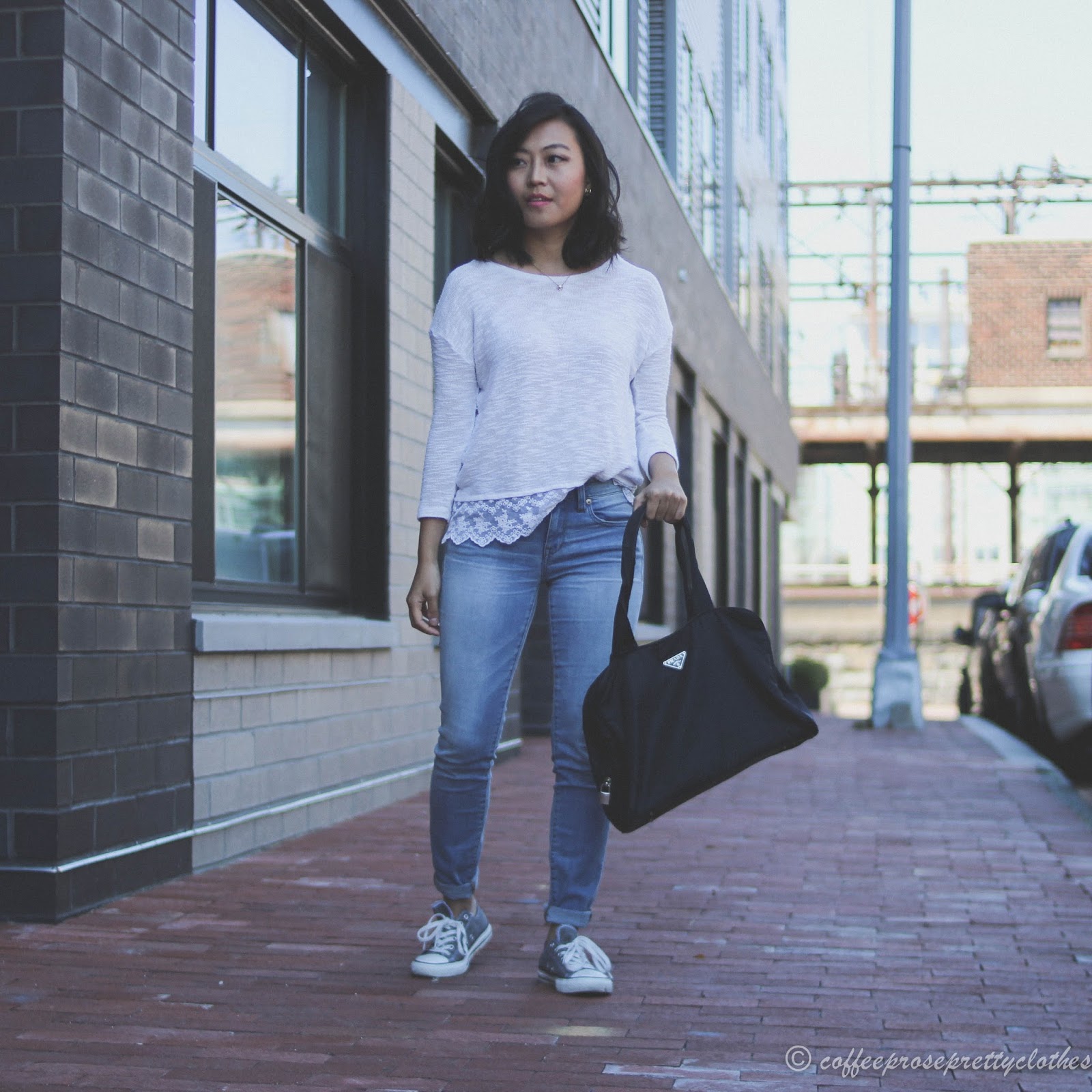 Top: H&M (similar here) || Bottoms: Madewell jeans || Accessories: Prada bag (similar here), Kate Spade necklace (similar here), Kate Spade earrings || Shoes: Converse