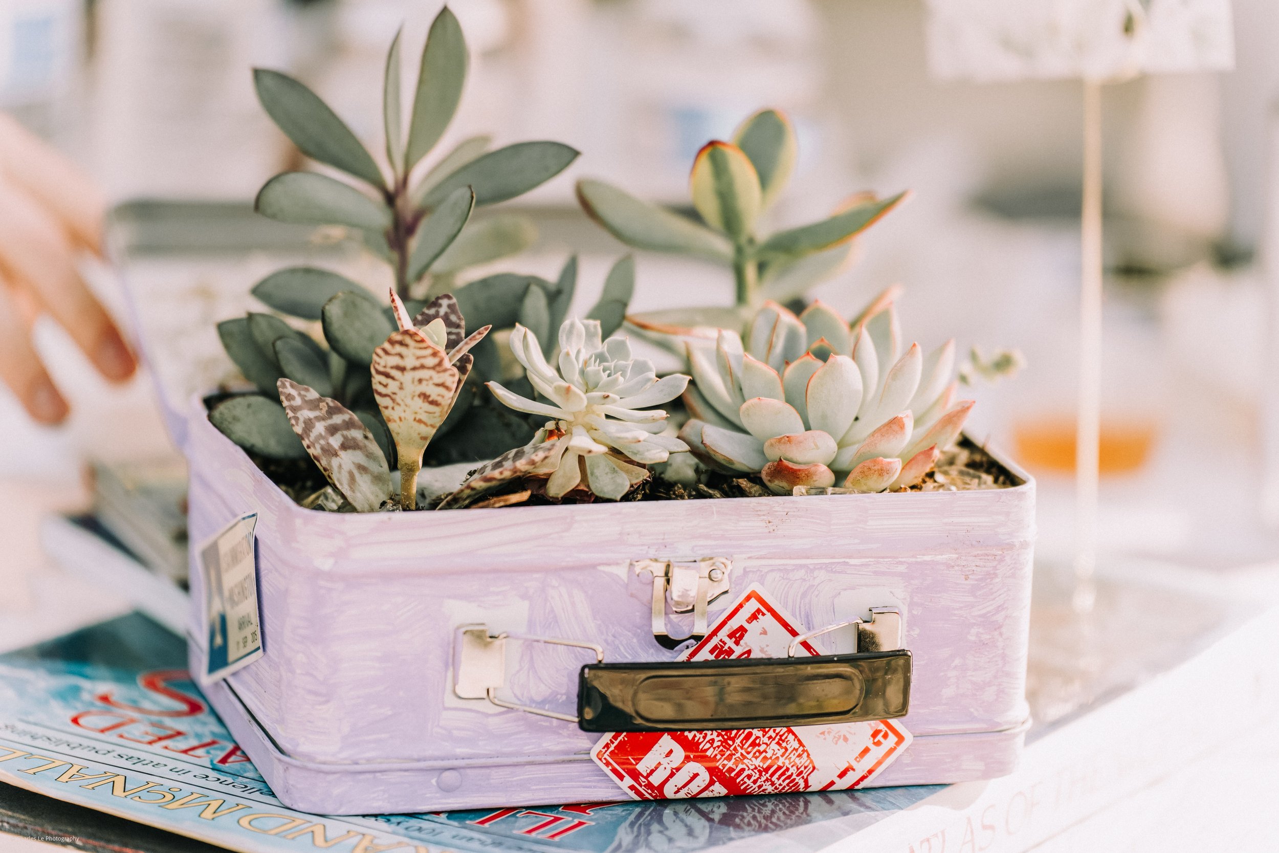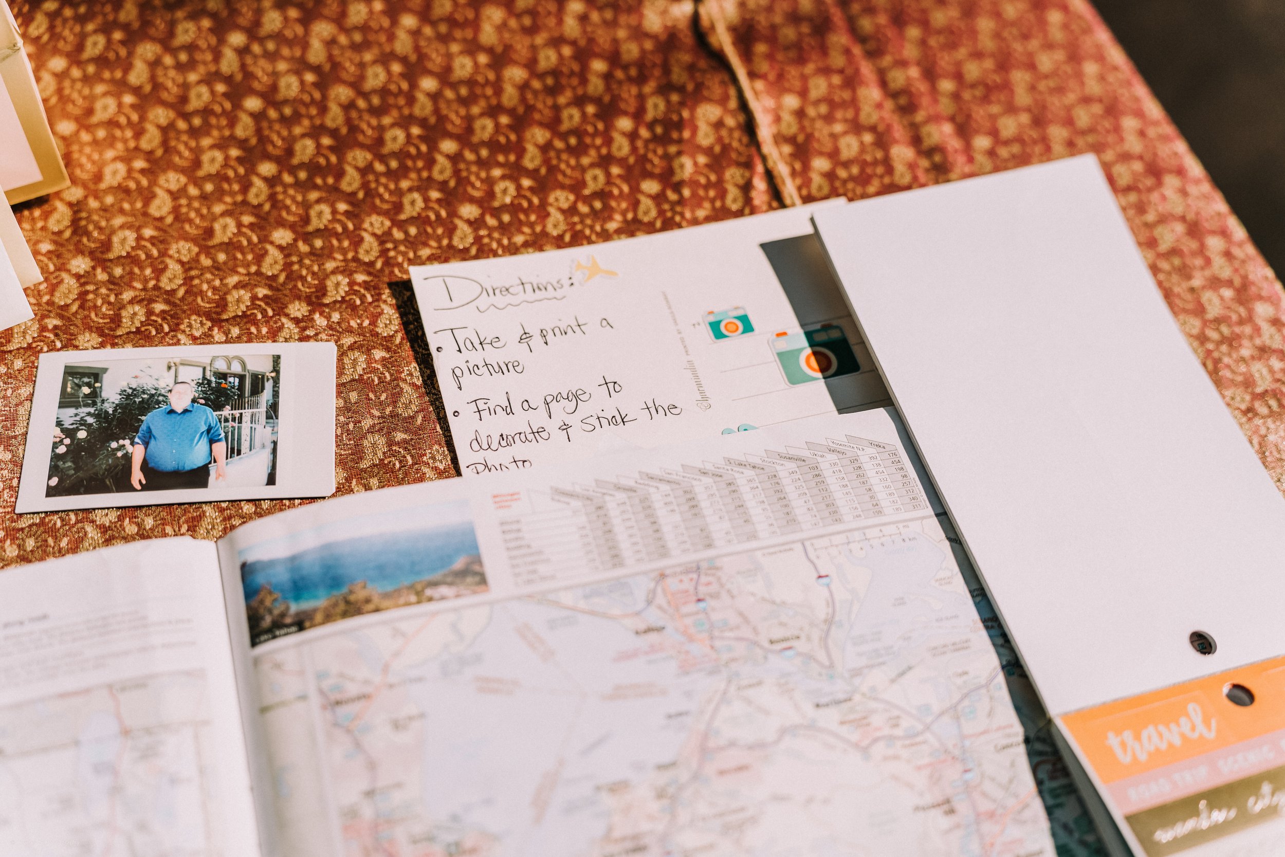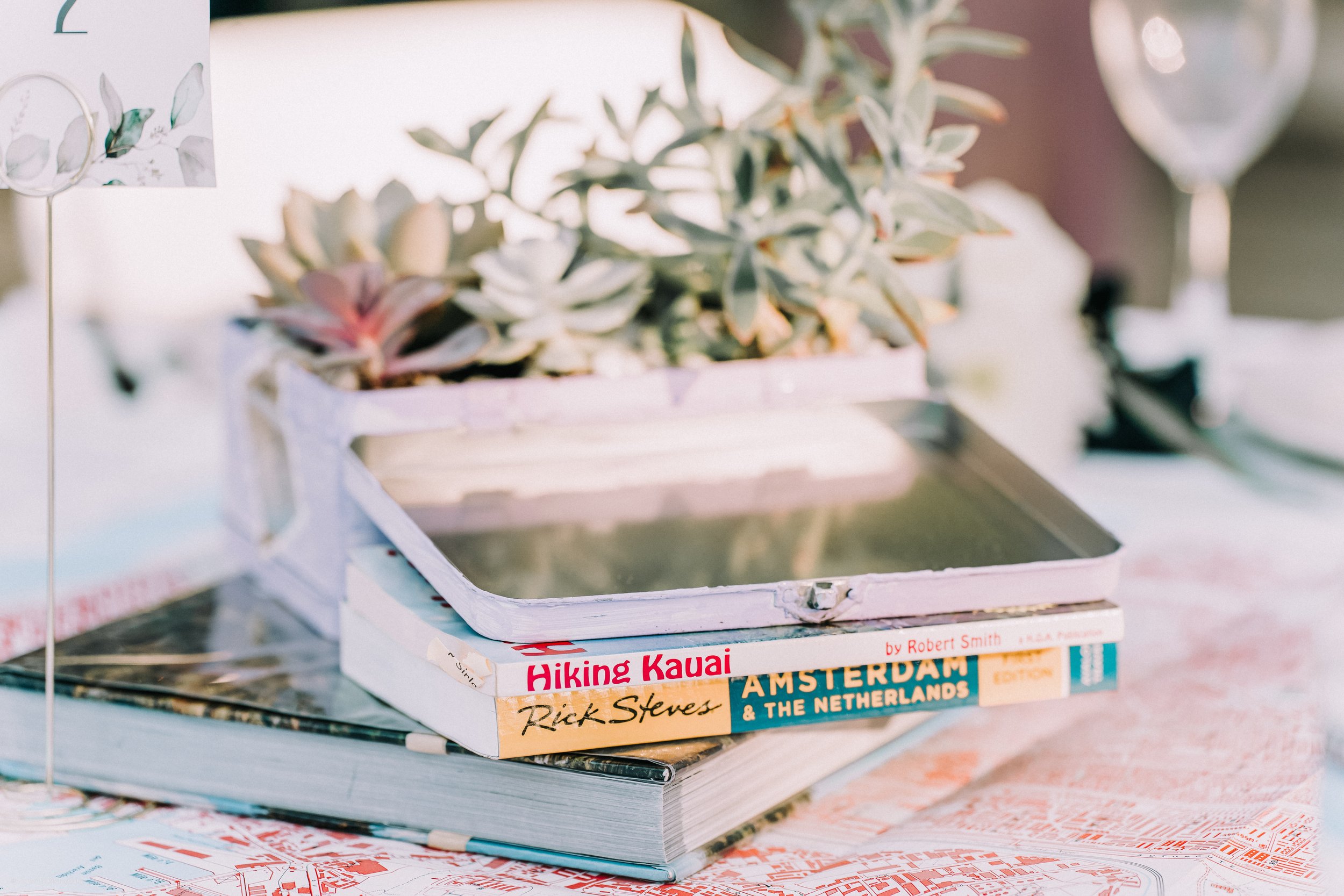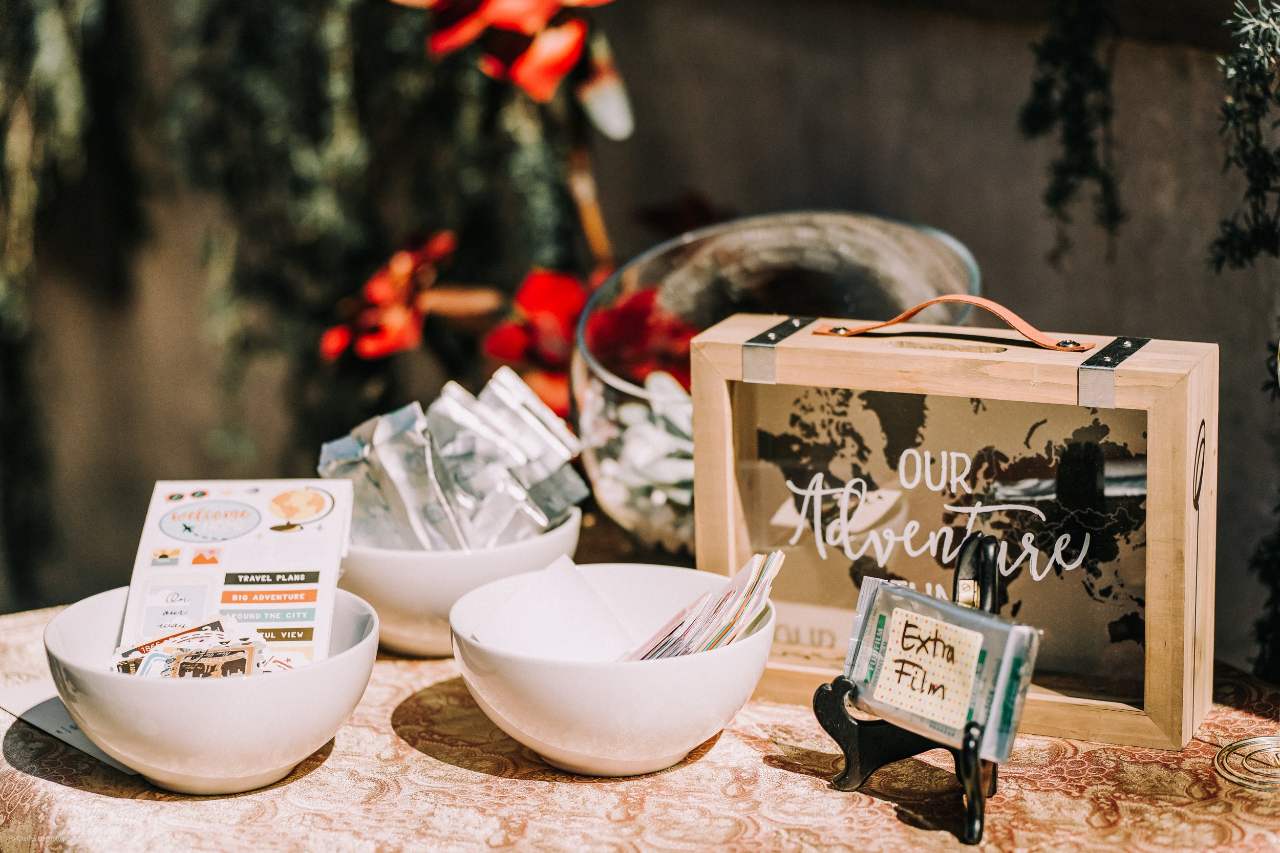 We went for a vintage travel theme! We didn’t go overboard with it but we did do a few things for it. For example, we purchased a bunch of vintage postcards from our local antique store and wrote guest names and table numbers on them. We also put out an old atlas in the entryway of the wedding that served as a guest book. We even put out a Fujifilm Instax Polaroid camera there as well to serve as both a photo booth and a thing to stick into the guest book. Finally, my mother-in-law and I painted a bunch of tin lunch boxes to look a bit like suitcases (we also stuck travel stickers on them) and we put our centerpieces in them. They were propped open by travel guide books.