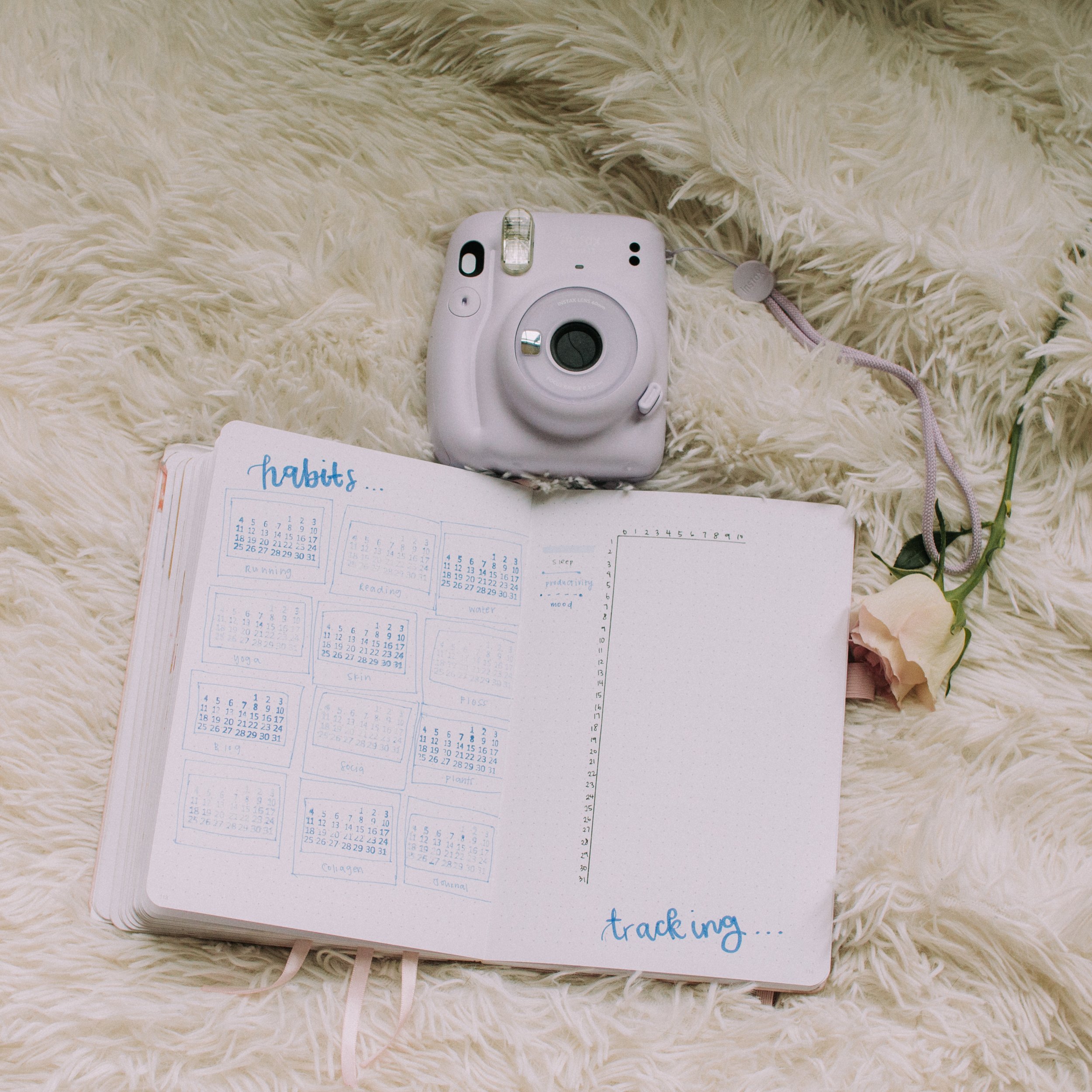 For my habit trackers, I used my calendar stamps but I tried to draw a few squares that resemble polaroid films around them… though I think I’m tracking too many habits to make it look worthwhile. Tracking the rest (sleep, mood, and productivity) is in graph mode. This is something new I started this year and it’s seriously the best!