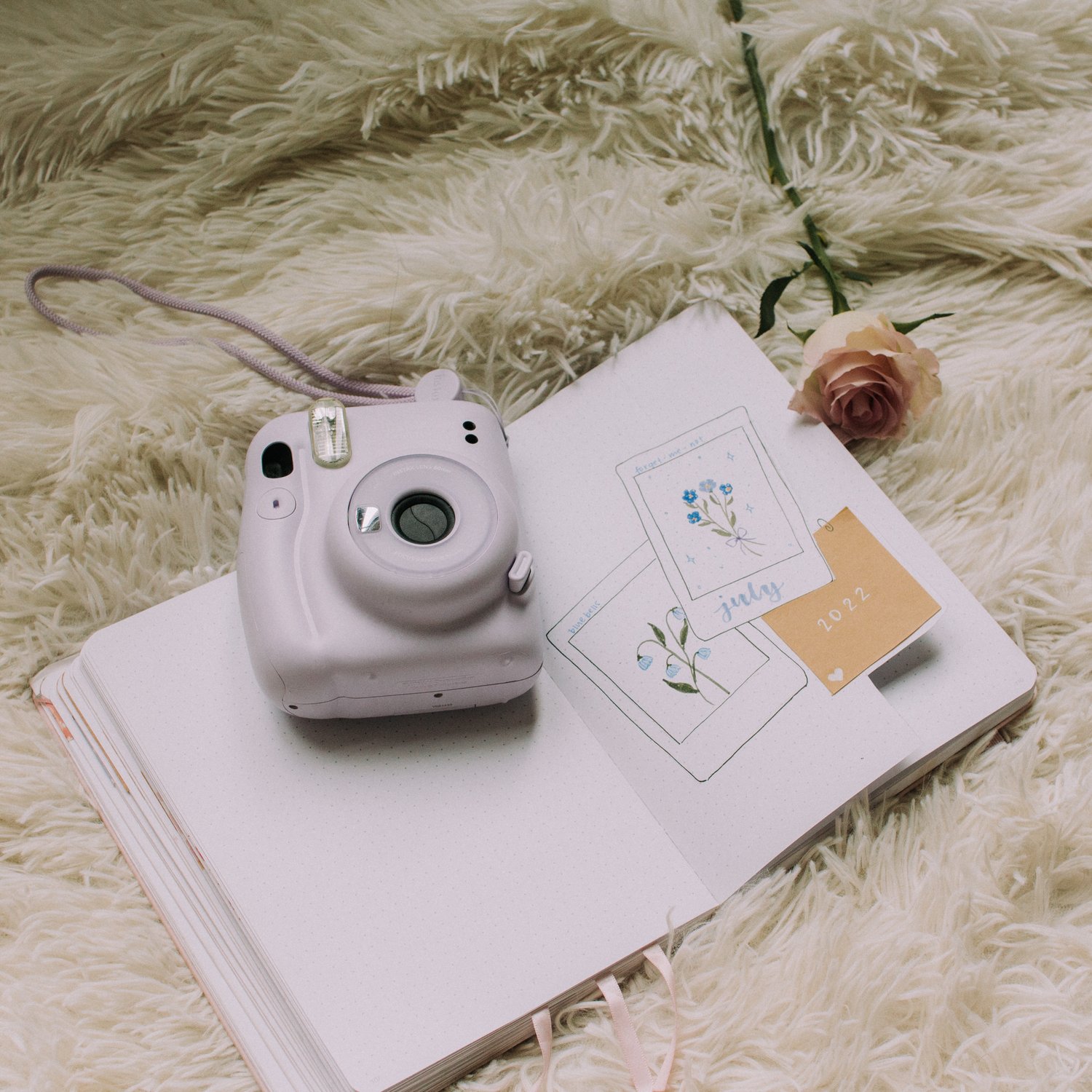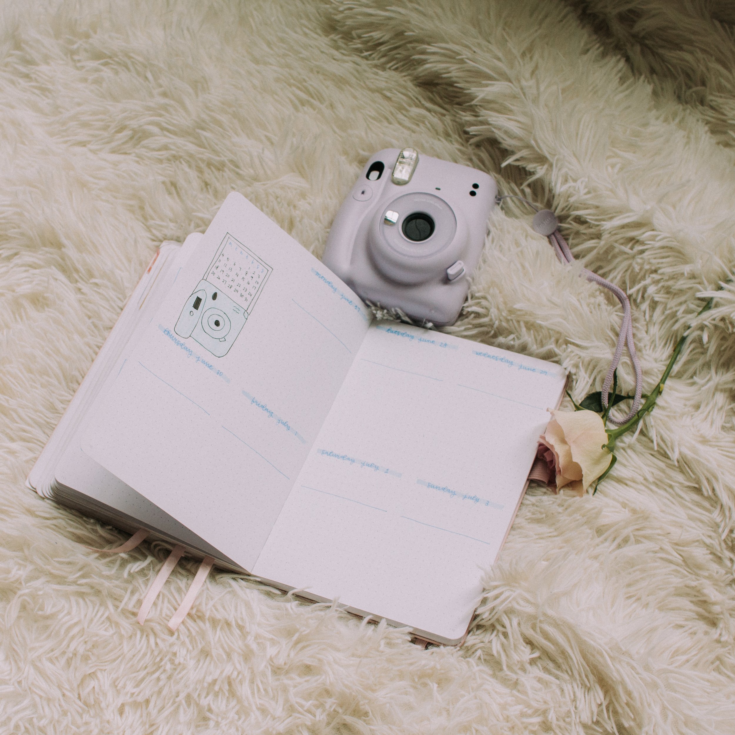 Finally, my first weekly! I drew a Fujifilm Instax Polaroid camera and a film coming out with the calendar on the side, but I kept the rest of the spread simple. I put the events at the top of each section and the to-do list at the bottom to keep things organized
